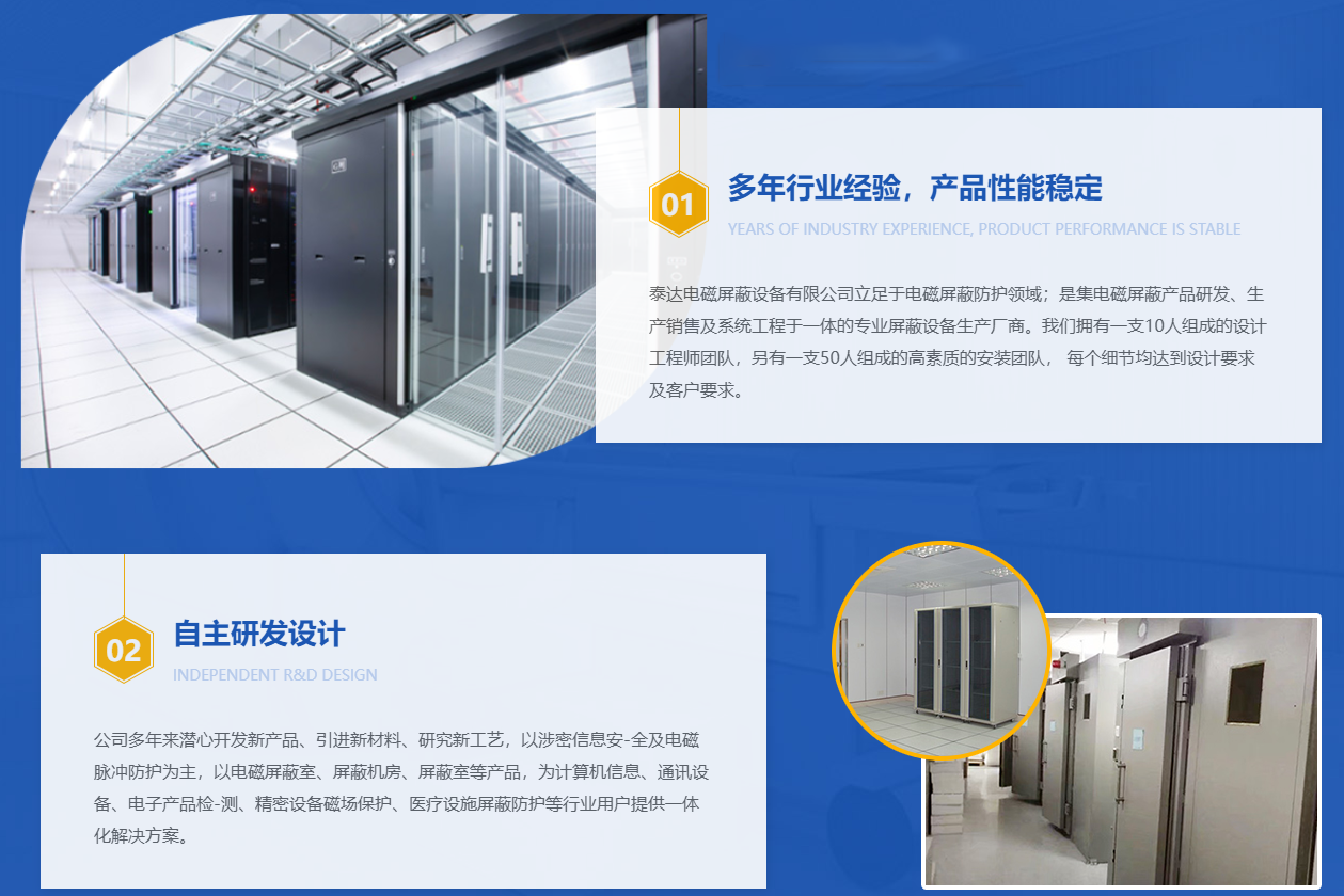 南陽市泰達電磁屏蔽設備有限公司一家專業(yè)從事高性能電磁屏蔽室、屏蔽機房、屏蔽室、電磁屏蔽機房、屏蔽門等設備的開發(fā)、生產(chǎn)、安裝的專業(yè)企業(yè)。目前我公司以擁有國內(nèi)較好的電磁兼容科研人員和高素質(zhì)的現(xiàn)場安裝力量,我公司有員工20余名包括技術、設計3名,我們的屏蔽機房已得到用戶好評。公司生產(chǎn)的屏蔽機房及屏蔽設備效能穩(wěn)定,使用方便,美觀大方,并能有效抑制工業(yè)和空間電磁場對室內(nèi)電子設備的干擾,防止機密電磁信息的泄露,它廣泛應用于電子通訊、產(chǎn)品的生產(chǎn)調(diào)試、故障搶修、計量電磁、兼容測試,計算機、醫(yī)療設備、人防…